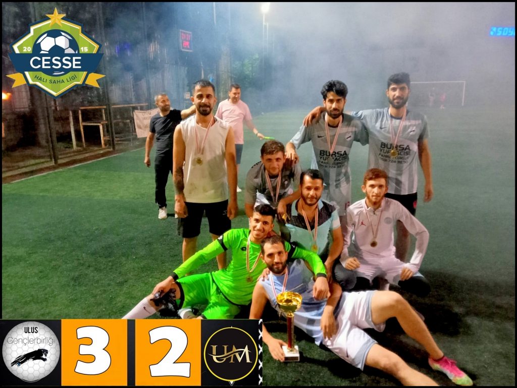 Cesse Halısaha Ligi 2022 Açılış Sezonu final maçında Ulus Gb takımı Umut Mobilya’yı 3 2 lik skorla geçerek tarihinde ilk defa Şampiyonluk yaşadı ve kupaya uzandı. Maça istediği gibi başlayamayan ekip rakibin baskılı oyununu kırmakta zorlanırken ilk bölümlerde kalelerinde çok pozisyon vermelerine karşın ilk yarının ortalarında oyuna denge getirmeyi başardı. Rakip kaleye de gitmeye başlayan ekip pozisyon bulmakta zorlansalar da kalelerini iyi savunarak devreye 0 0 lık eşitlikle girdiler. 2. Yarıya Cengiz’in golüyle başlayan ekip skora denge gelse de buldukları pozisyonları iyi değerlendirerek skoru 3 1 e getirmesini bildiler. Son dakikada fark 1 e inse de skora denge gelmesine izin vermeyen ekip sahadan 3 2 lik skorla galip ayrılıp kupayı müzesine götürmeyi başardı. Abdurrahman takımının 2. Golüne imza atarken pozisyonu hazırlayışı topu götürüşü adeta sezonun özeti olurken bu kritik golle kilidi açan isimlerden oldu, sezonu gol kralı olarak tamamlayan Cengiz ise 2 gol ve klas bir asistle finale damga vuran bir diğer isim oldu. Tabi savunma hattının olağan üstü performansı maçın dikkat çekilmesi gereken unsuru olurken Ahmet soğukkanlılığı ve yerinde hamleleriyle ön plana çıkan isim oldu.
