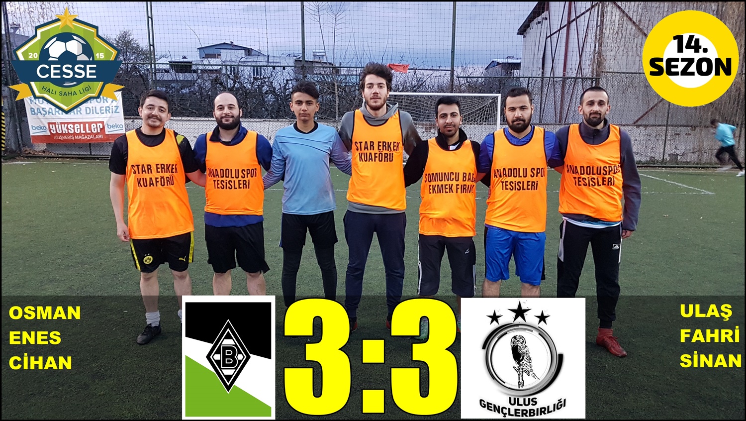 Mezungladbach takımı maça iyi başlarken skor avantajını ilk yarıdan eline aldı ve devreye 3 1 lik skor avantajıyla girdi. 2. yarıda vites düşüren ekip pozisyon bulmakta zorlanırken savunma hattının özverili oyunuyla ayakta durmaya çalıştılar. Skor 3 yken Kaptan Enes rakip kaleciyle karşı karşıya kaldığı pozisyonu cömertçe harcayınca net fırsatı değerlendiremezken dönen topun kalelerinde gol olmasıyla takımını yaktı ve olası bir galibiyet şansını değerlendiremedi. Savunmada Ömer ve özellikle Osman oldukça gayretli bir görüntü sergilerken Cihan dahi hücum hattından savunmaya bir çok kez yardıma gelirken kaptan Enes vasatı geçemedi.